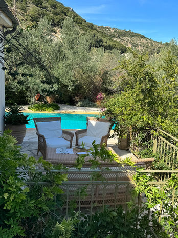 A secluded single-storey, two-bedroom garden villa with a private pool, surrounded by olive groves and vineyards, offering glorious mountain and wide sea views.
